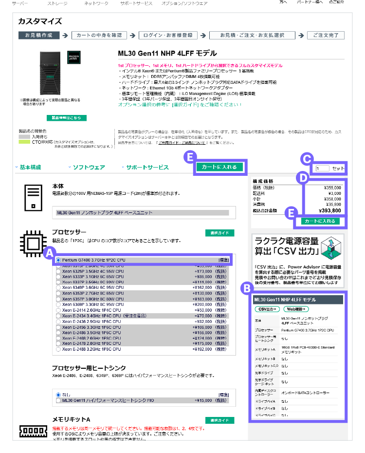 カスタマイズページにて、ご希望の構成をお選びください。製品の構成が決まりましたら、「カートに入れる」ボタンをクリックしてください。