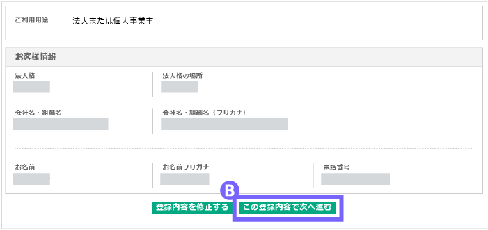 お客様登録の内容をご確認の上、「この登録内容で次へ進む」をクリックしてください。